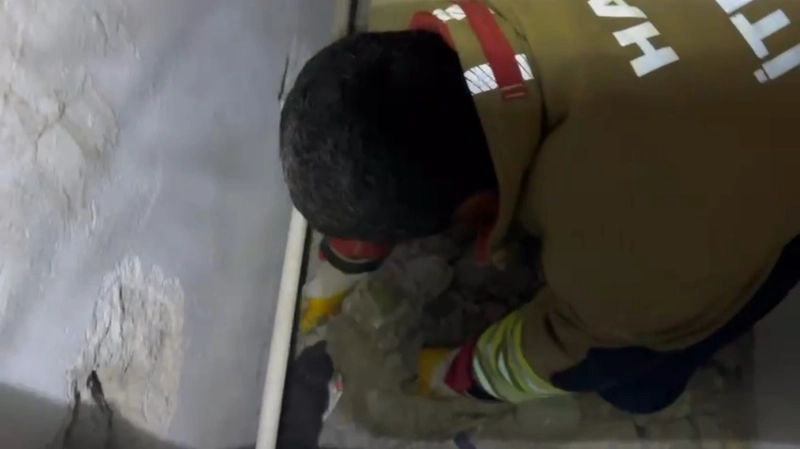 Hatay’da havalandırma boşluğuna düşen yavru kedi kurtarıldı