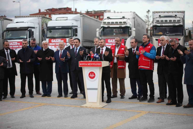 Konya'dan Gazze'ye ulaştırılmak üzere 15 tır insani yardım malzemesi, düzenlenen törenle dualarla yola çıktı. Panorama Müzesi Parkı'nda gerçekleşen uğurlama programına Konya İl Müftülüğü ve Türkiye Diyanet Vakfı Konya Şubesi ev sahipliği yaptı.