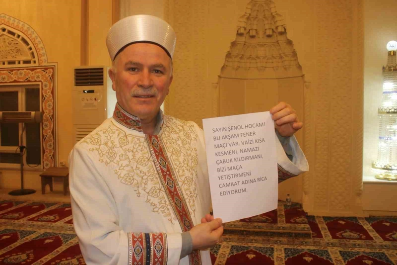 Giresun'un Görele ilçesinde, Kumyalı Mahallesi'ndeki Şehitlik Camii'nde geçtiğimiz pazartesi akşamı teravih namazı öncesi ilginç bir olay yaşandı. İmam Şenol Yılmaz, vaaz vermek üzere kürsüye çıktığında minberde bir notla karşılaştı. Notta, "Bu akşam Fener maçı var. Vaizi kısa kesmeni, namazı çabuk kıldırmanı, bizi maça yetiştirmeni rica ediyoruz" yazıyordu.