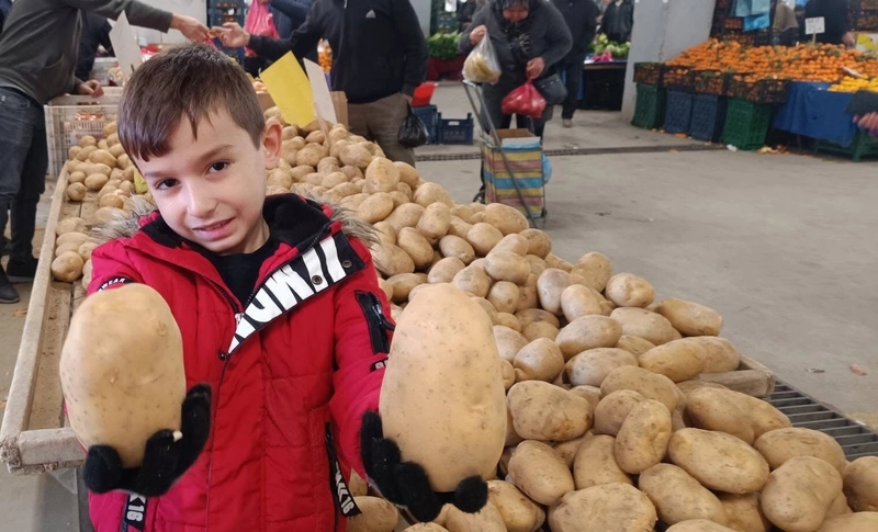 Dev patatesler, çocukların da ilgisini çekti. Anne ve babasından izin alarak tezgaha yaklaşan küçük Yağız Sarıkaya, iki dev patatesi eline alarak fotoğraf çektirmeyi ihmal etmedi.